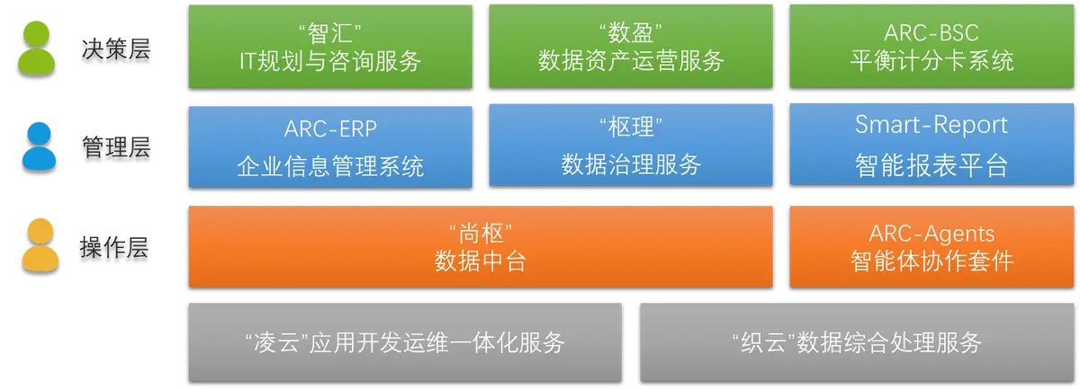 在決策層,“智匯”IT規(guī)劃與咨詢服務(wù),憑借專業(yè)團隊對行業(yè)趨勢和技術(shù)生態(tài)的深度洞察,為企業(yè)量身定制契合發(fā)展戰(zhàn)略的IT架構(gòu)藍(lán)圖,明晰數(shù)字化路徑;“數(shù)盈”數(shù)據(jù)資產(chǎn)運營服務(wù),挖掘企業(yè)數(shù)據(jù)價值,將分散數(shù)據(jù)轉(zhuǎn)化為可運營、能創(chuàng)造效益的資產(chǎn),驅(qū)動業(yè)務(wù)創(chuàng)新;ARC - BSC平衡計分卡系統(tǒng),以戰(zhàn)略為導(dǎo)向,從財務(wù)、客戶、內(nèi)部流程、學(xué)習(xí)與成長等維度,量化指標(biāo)、監(jiān)控進度,助力科學(xué)決策 。